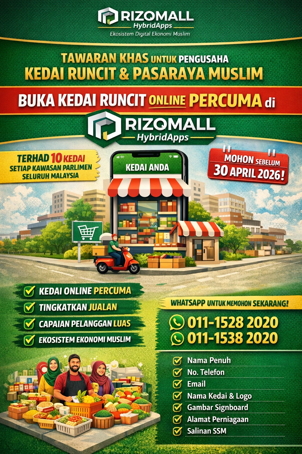 RIZQMALL HybridApps membuka peluang kepada pengusaha kedai runcit dan pasaraya Muslim di seluruh Malaysia untuk menyertai platform digital kami dan membuka kedai runcit online secara PERCUMA.